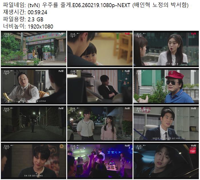 | (tvN) 우주를 줄게.E06.260219.1080p-NEXT (배인혁 노정의 박서함).mp4 | 2.3 G | 00:59:24 | 1920x1080 |