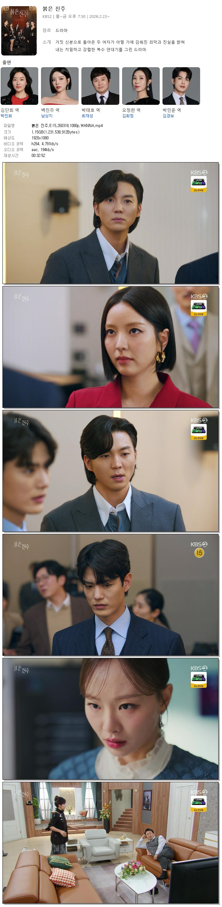 | [KBS2] 붉은 진주.E15.260318.1080p.WANNA[박진희, 남상지].mp4 | 1.1 G | 00:32:52 | 1920x1080 |