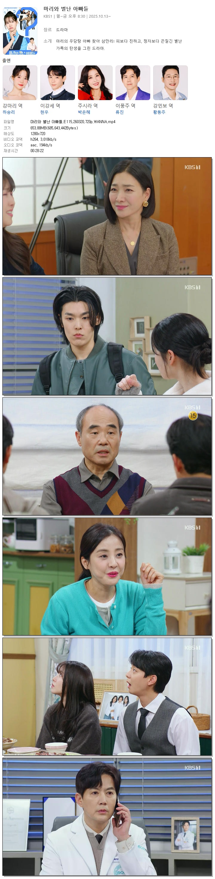 | [KBS1] 마리와 별난 아빠들.E115.260320.720p.WANNA[하승리, 현우].mp4 | 653.9 M | 00:28:22 | 1280x720 |