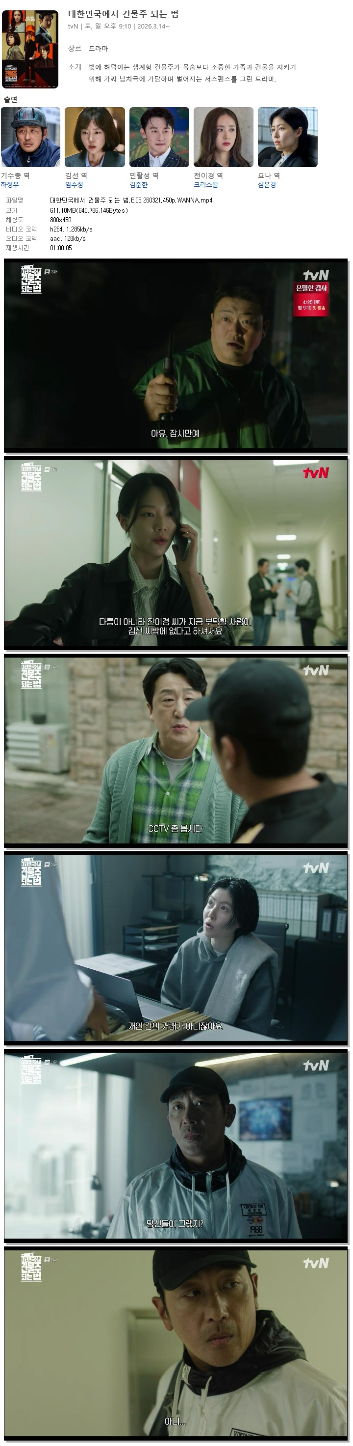 | [TVN] 대한민국에서 건물주 되는 법.E03.260321.450p.WANNA[하정우, 임수정].mp4 | 611.1 M | 01:00:05 | 800x450 |