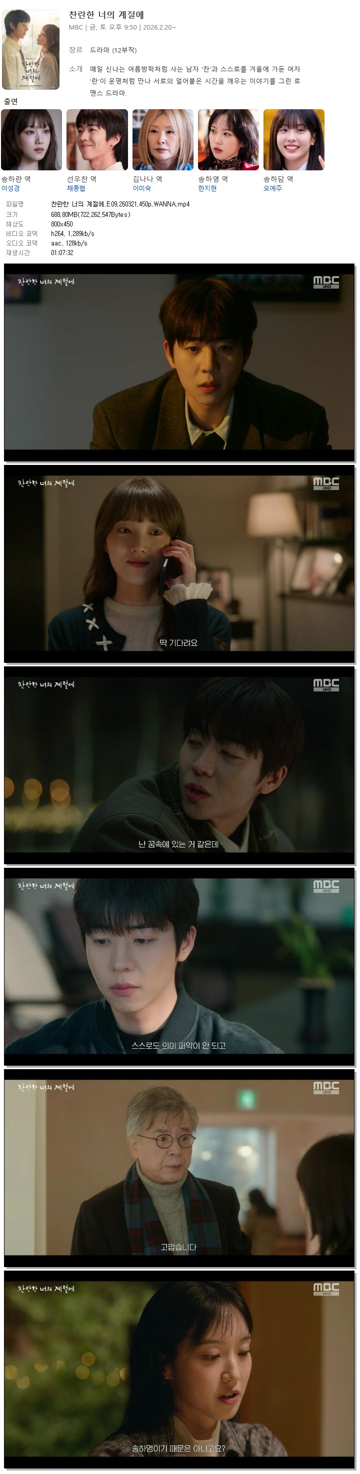 | [MBC] 찬란한 너의 계절에.E09.260321.450p.WANNA[이성경, 채종협].mp4 | 688.8 M | 01:07:32 | 800x450 |