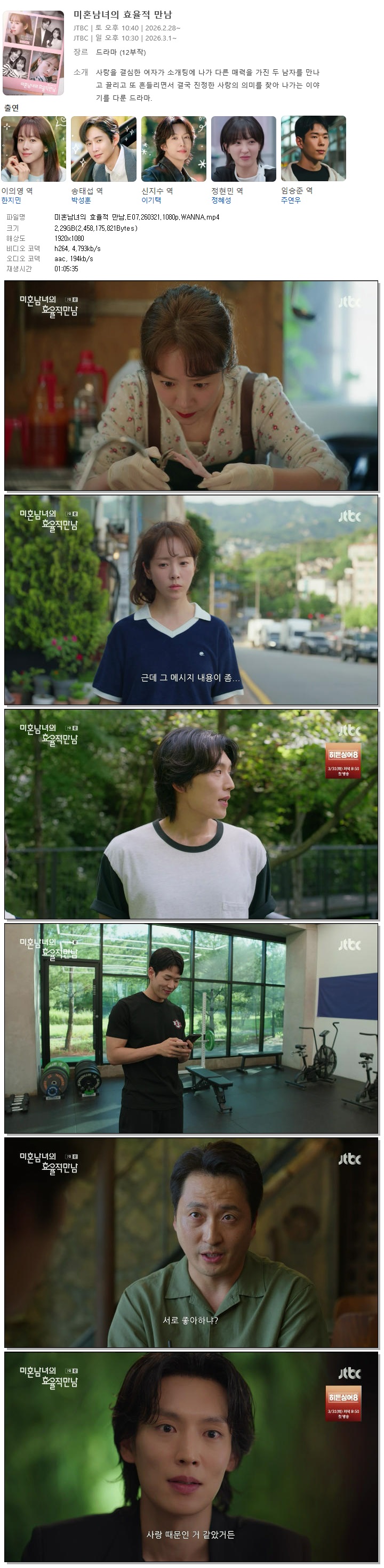 | [JTBC] 미혼남녀의 효율적 만남.E07.260321.1080p.WANNA[한지민, 박성훈].mp4 | 2.3 G | 01:05:35 | 1920x1080 |