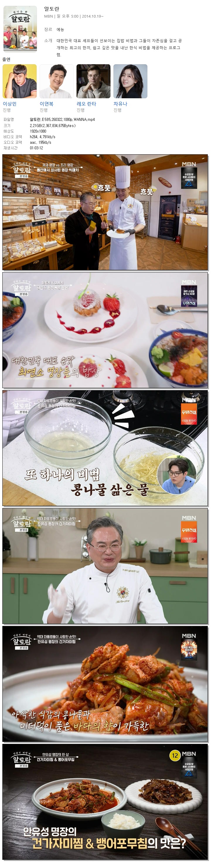 | [MBN] 알토란.E585.260322.1080p.WANNA[이상민, 이연복].mp4 | 2.2 G | 01:03:12 | 1920x1080 |