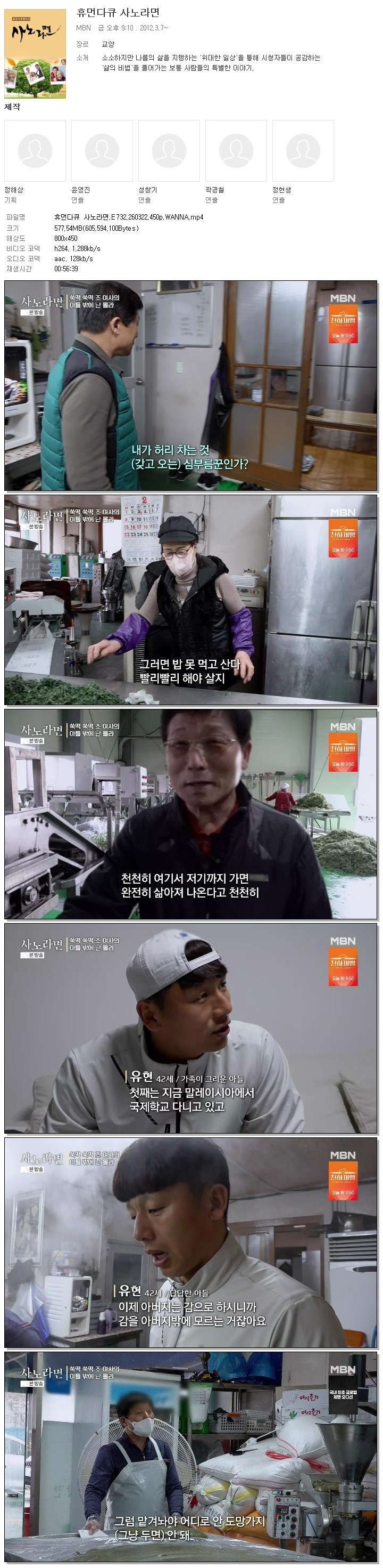 | [MBN] 휴먼다큐 사노라면.E732.260322.450p.WANNA.mp4 | 577.5 M | 00:56:39 | 800x450 |