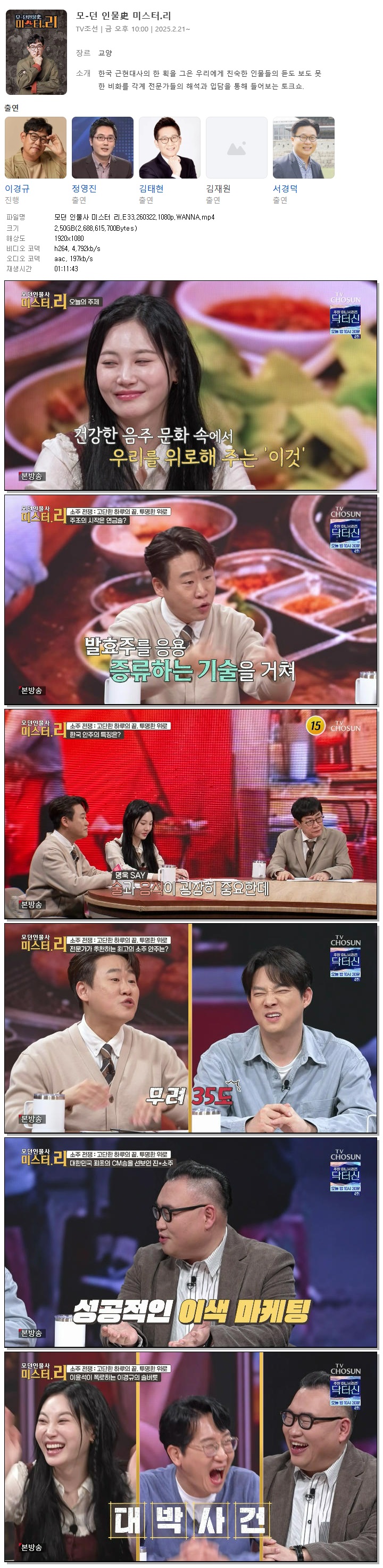 | [TV조선] 모던 인물사 미스터 리.E33.260322.1080p.WANNA[이경규].mp4 | 2.5 G | 01:11:43 | 1920x1080 |