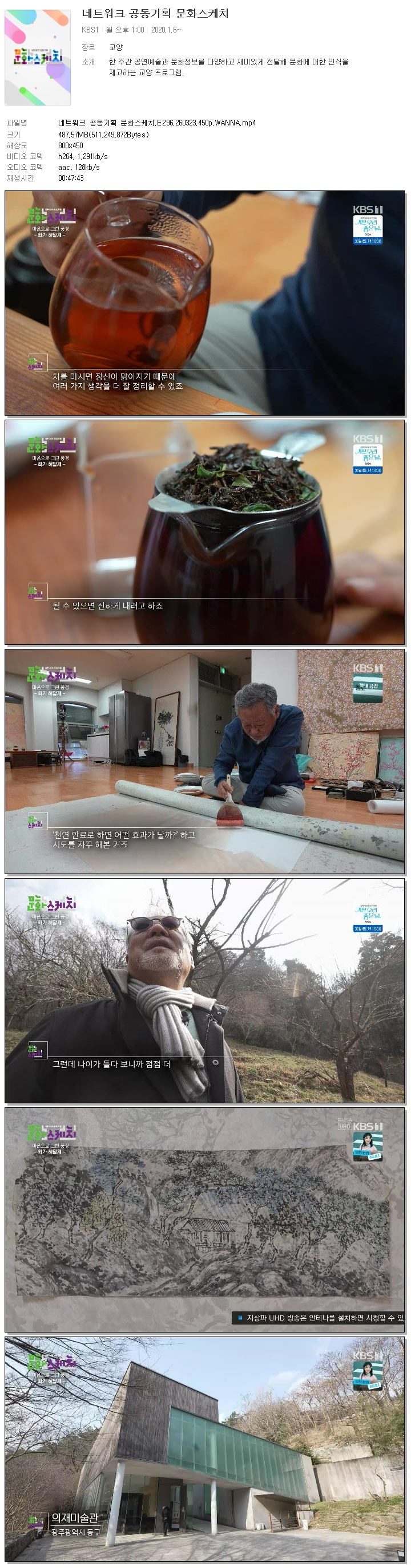 | [KBS1] 네트워크 공동기획 문화스케치.E296.260323.450p.WANNA.mp4 | 487.6 M | 00:47:43 | 800x450 |
