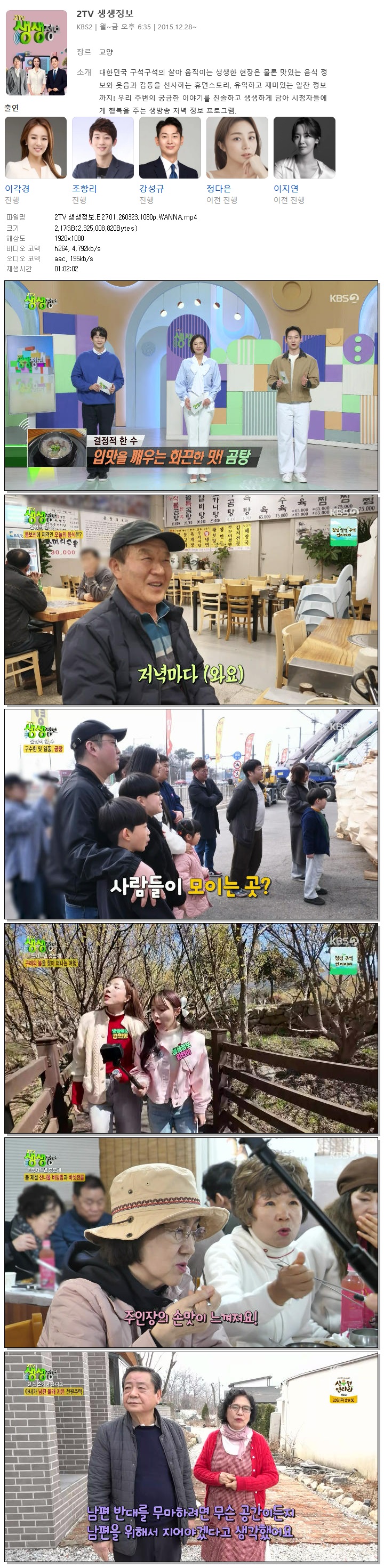 | [KBS2] 2TV 생생정보.E2701.260323.1080p.WANNA[이각경, 조항리].mp4 | 2.2 G | 01:02:02 | 1920x1080 |