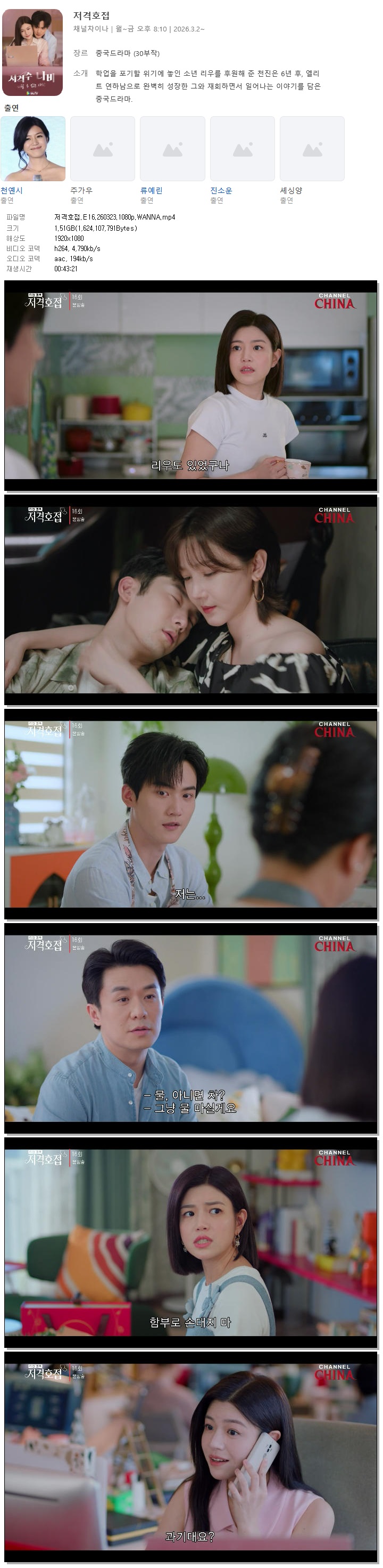 | [채널차이나] 저격호접.E16.260323.1080p.WANNA[천옌시, 주가우].mp4 | 1.5 G | 00:43:21 | 1920x1080 |