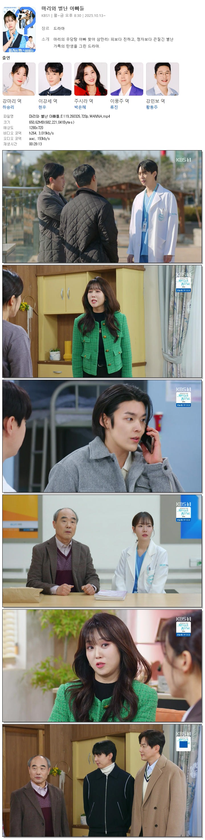 [KBS1] 마리와 별난 아빠들.E119.260326.720p.WANNA[하승리, 현우].mp4 650.6 M 00:28:13 1280x720