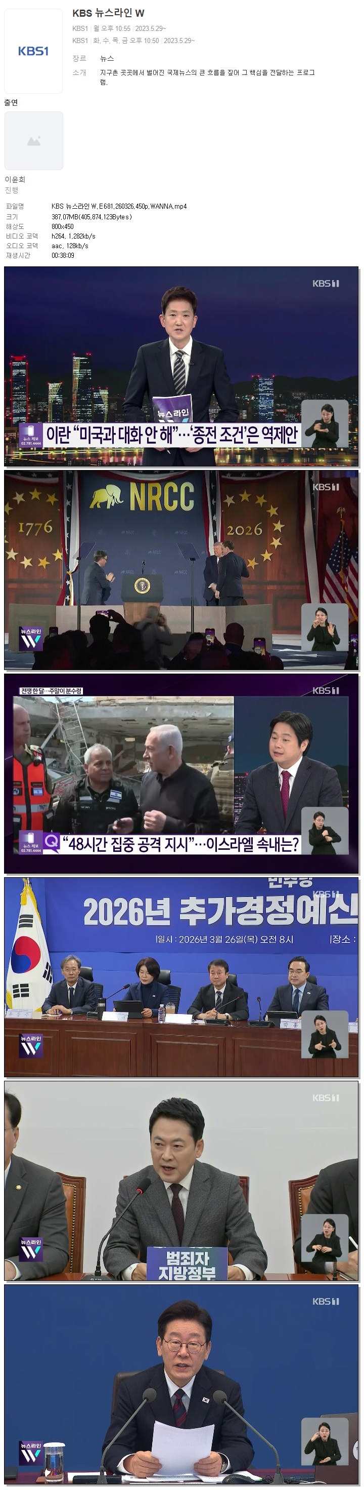 | [KBS1] KBS 뉴스라인W.E681.260326.450p.WANNA.mp4 | 387.1 M | 00:38:09 | 800x450 |