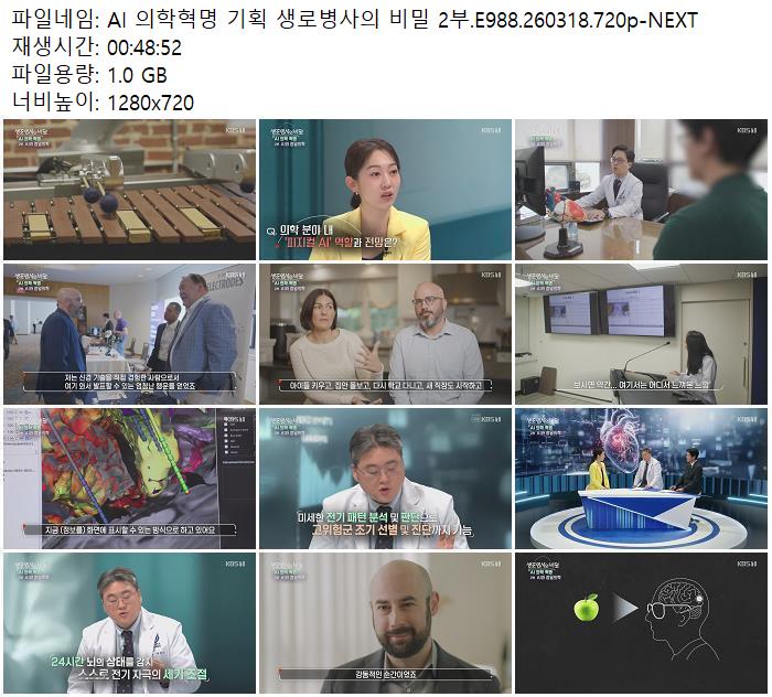 | AI 의학혁명 기획 생로병사의 비밀 2부.E988.260318.720p-NEXT.mp4 | 1 G | 00:48:52 | 1280x720 |