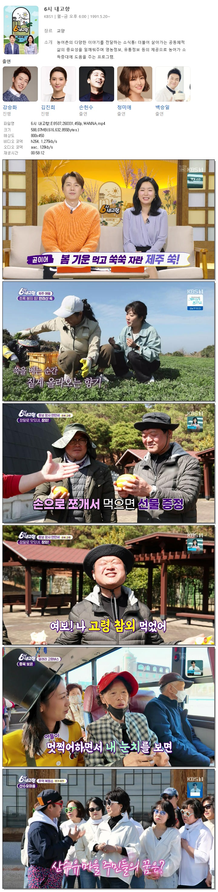 | [KBS1] 6시 내고향.E8507.260331.450p.WANNA[강승화, 김진희].mp4 | 588.1 M | 00:58:12 | 800x450 |