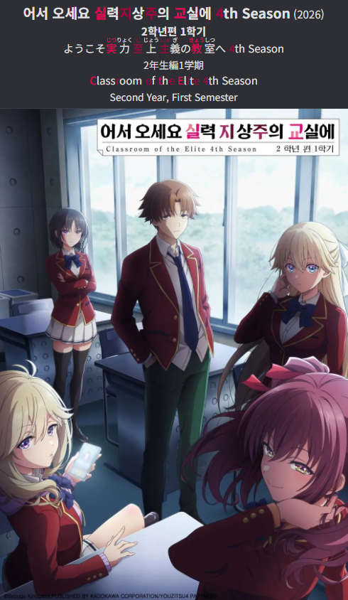 | 어서 오세요 실력 지상주의 교실에 4기 2학년 편 1학기.E02.260402.1080p.WANNA.mp4 | 837.1 M | 00:23:25 | 1920x1080 |