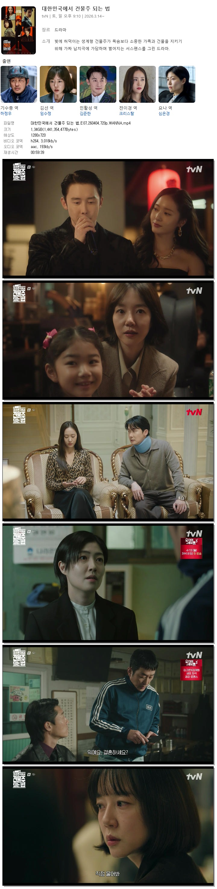 [TVN] 대한민국에서 건물주 되는 법.E07.260404.720p.WANNA[하정우, 임수정].mp4 1.3 G 00:59:39 1280x720