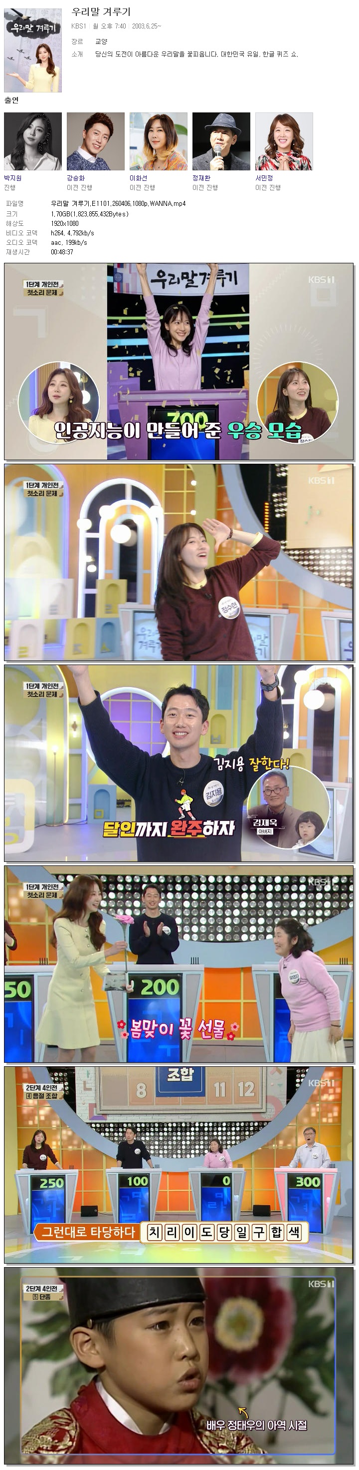 | [KBS1] 우리말 겨루기.E1101.260406.1080p.WANNA[박지원].mp4 | 1.7 G | 00:48:37 | 1920x1080 |
