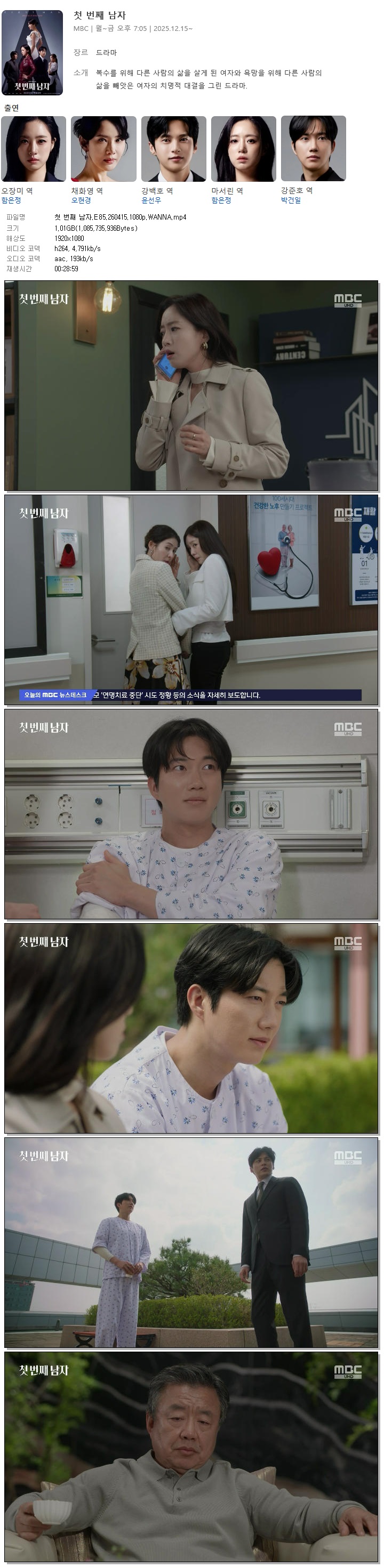 | [MBC] 첫 번째 남자.E85.260415.1080p.WANNA[함은정, 오현경].mp4 | 1 G | 00:28:59 | 1920x1080 |