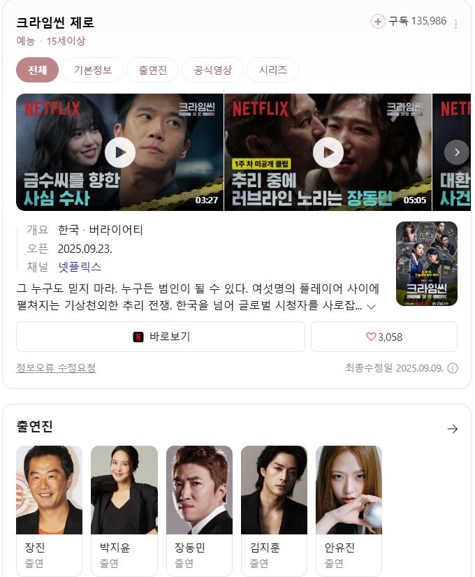ico[화 넷플 1600 10부작] 크라임씬 제로 박지윤 장동민 안유진/