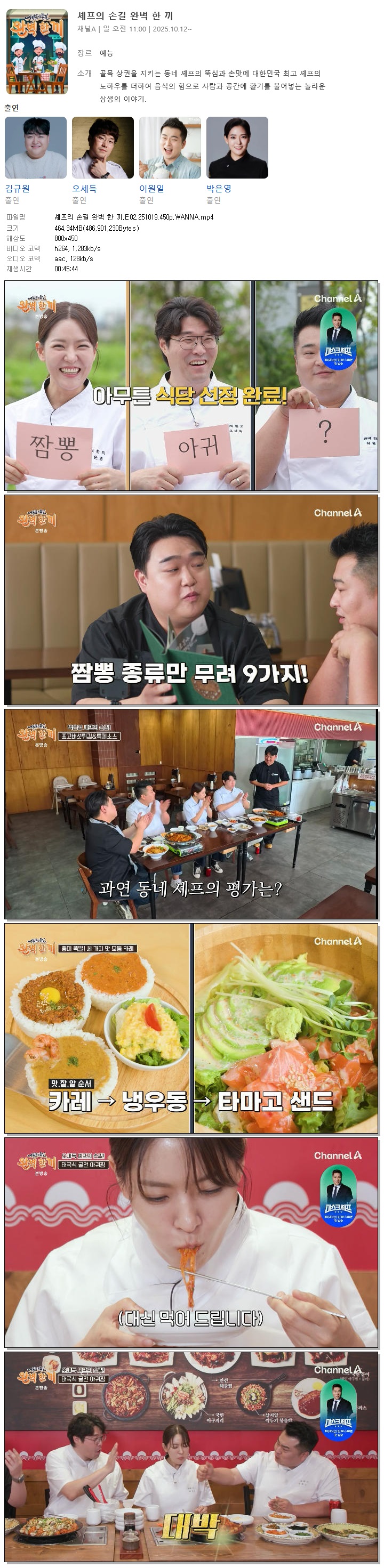 [채널A] 셰프의 손길 완벽 한 끼.E02.251019.450p.WANNA[김규원, 오세득].mp4 | 464.3 M | 00:45:44 | 800x450 |