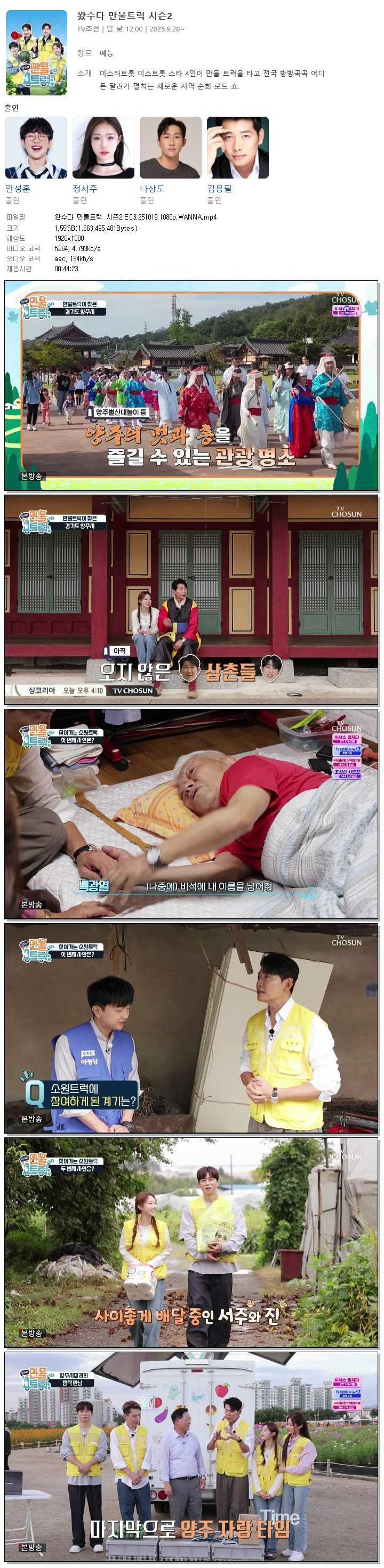 [TV조선] 왔수다 만물트럭 시즌2.E03.251019.1080p.WANNA[안성훈, 정서주].mp4 | 1.5 G | 00:44:23 | 1920x1080 |