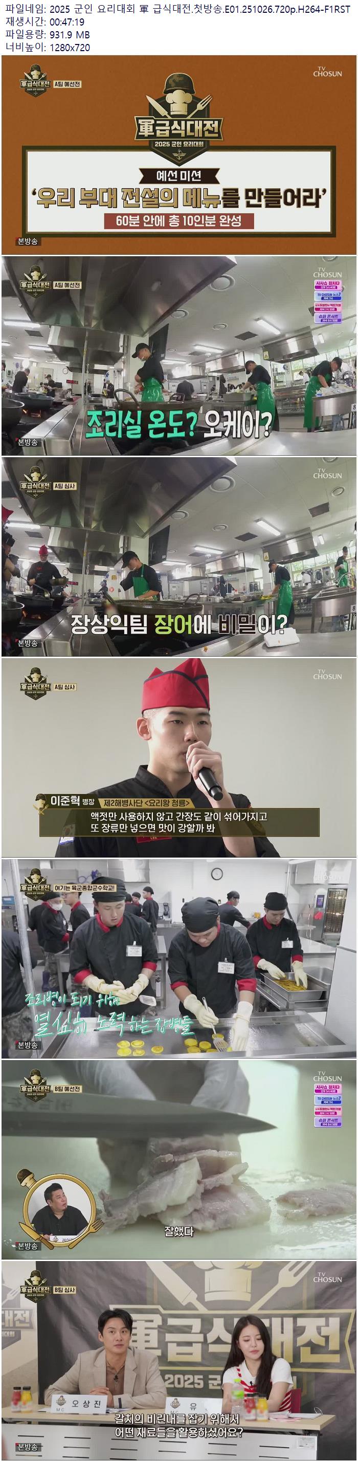 | 2025 군인 요리대회 軍 급식대전.첫방송.E01.251026.720p.H264-F1RST.mp4 | 931.9 M | - | 1280x720 |