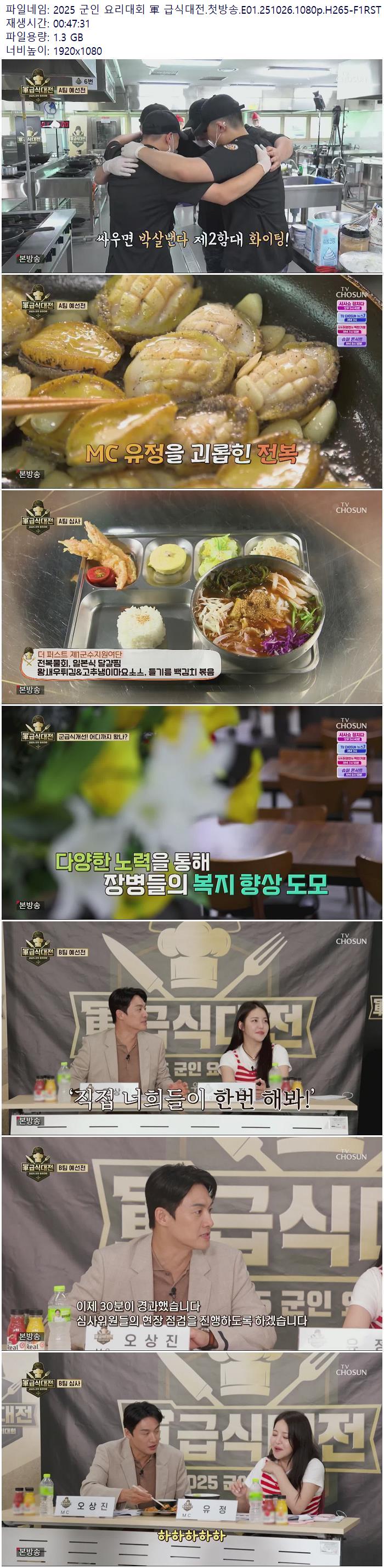 | 2025 군인 요리대회 軍 급식대전.첫방송.E01.251026.1080p.H265-F1RST.mp4 | 1.3 G | - | 1920x1080 |