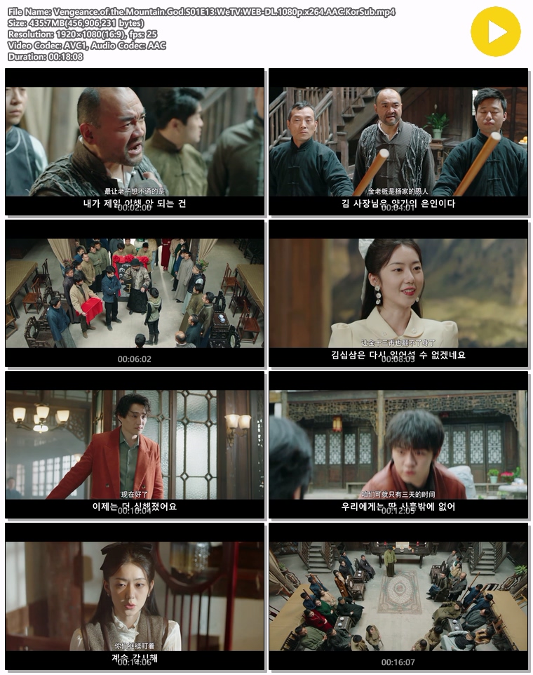 | Vengeance.of.the.Mountain.God.S01E13.WeTV.WEB-DL.1080p.x264.AAC.KorSub.mp4 | 435.7 M | 00:18:08 | 1920x1080 |