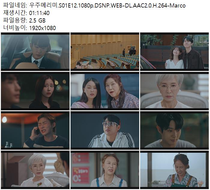 | 우주메리미.S01E12.1080p.DSNP.WEB-DL.AAC2.0.H.264-Marco.mkv | 2.5 G | - | 1920x1080 |