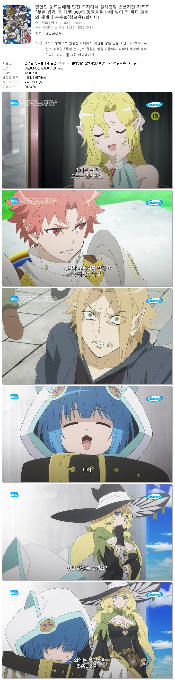 | 믿었던 동료들에게 던전 오지에서 살해당할 뻔했지만.E08.251122.720p.WANNA.mp4 | 552.8 M | 00:23:58 | 1280x720 |