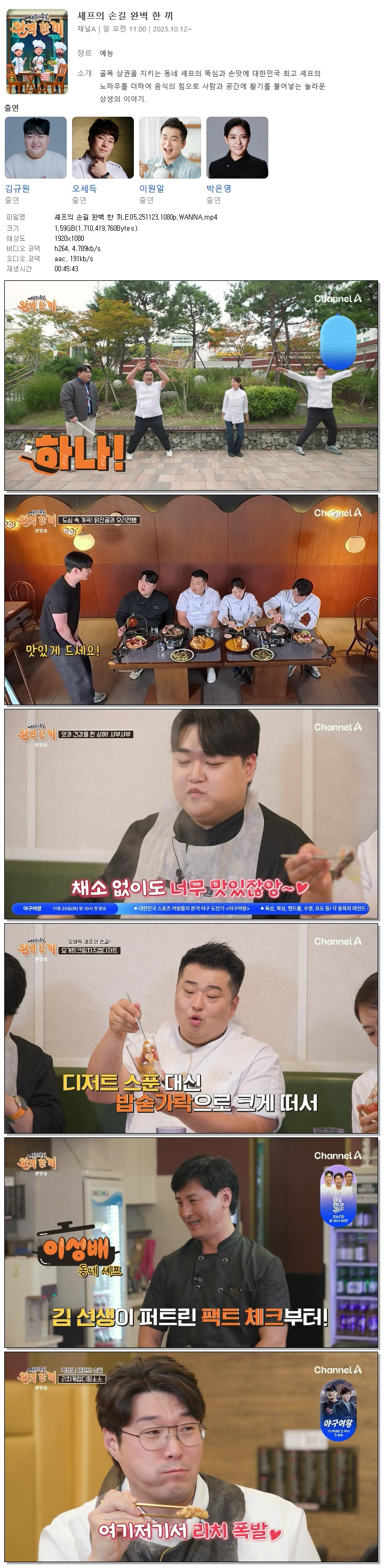 [채널A] 셰프의 손길 완벽 한 끼.E05.251123.1080p.WANNA[김규원, 오세득].mp4 1.6 G 00:45:43 1920x1080