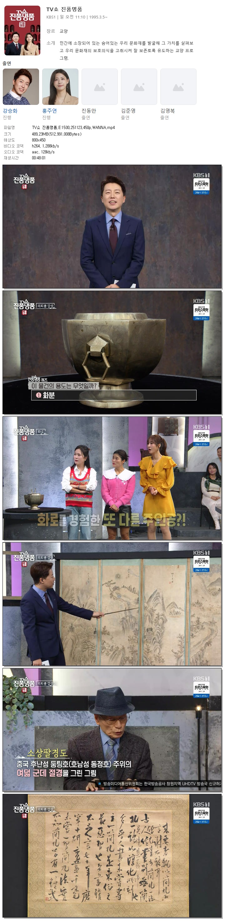 | [KBS1] TV쇼 진품명품.E1500.251123.450p.WANNA[강승화, 진동만].mp4 | 489.2 M | 00:48:01 | 800x450 |