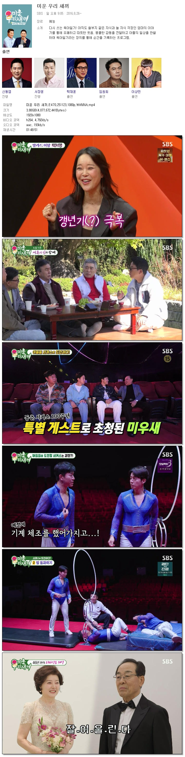 | [SBS] 미운 우리 새끼.E470.251123.1080p.WANNA[백지영, 임원희].mp4 | 3.8 G | 01:48:51 | 1920x1080 |