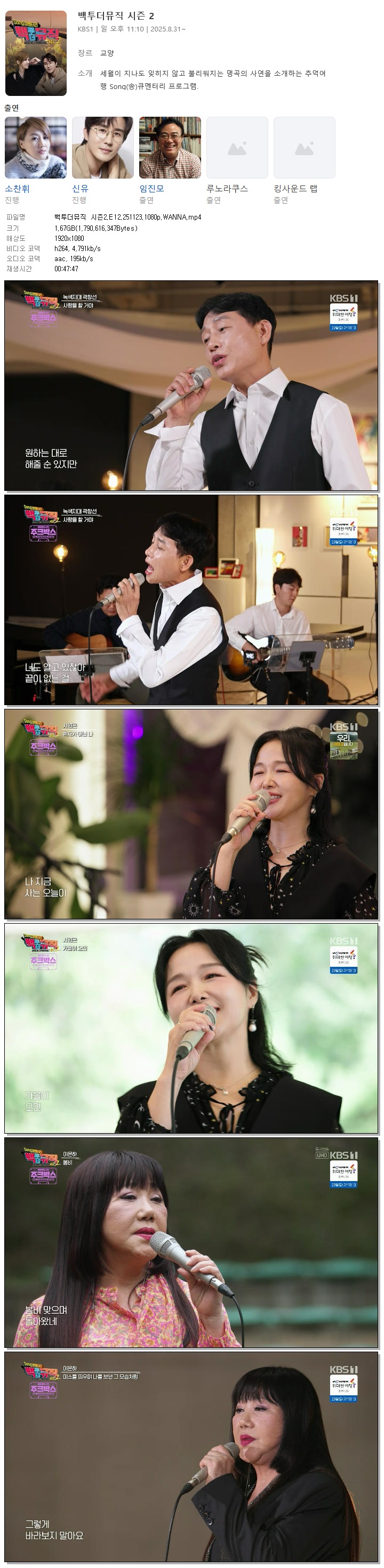 | [KBS1] 백투더뮤직 시즌2.E12.251123.1080p.WANNA[소찬휘, 신유].mp4 | 1.7 G | 00:47:47 | 1920x1080 |