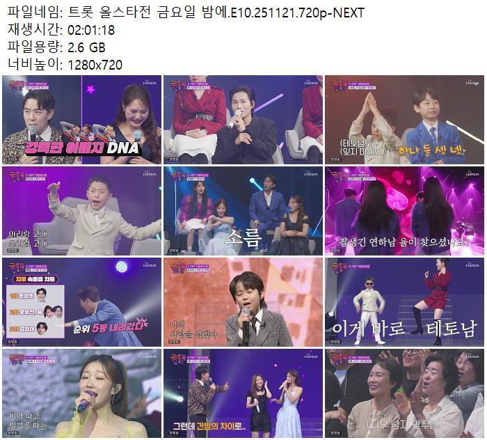 트롯 올스타전 금요일 밤에.E10.251121.720p-NEXT.mp4 2.6 G - 1280x720