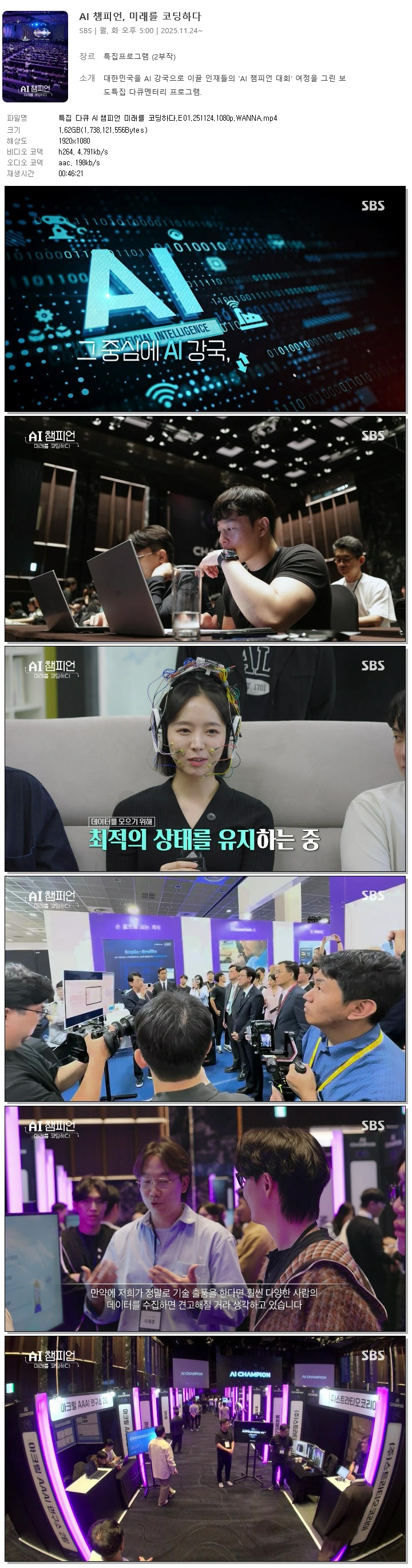 | [SBS] 특집 다큐 AI 챔피언 미래를 코딩하다.E01.251124.1080p.WANNA.mp4 | 1.6 G | 00:46:21 | 1920x1080 |