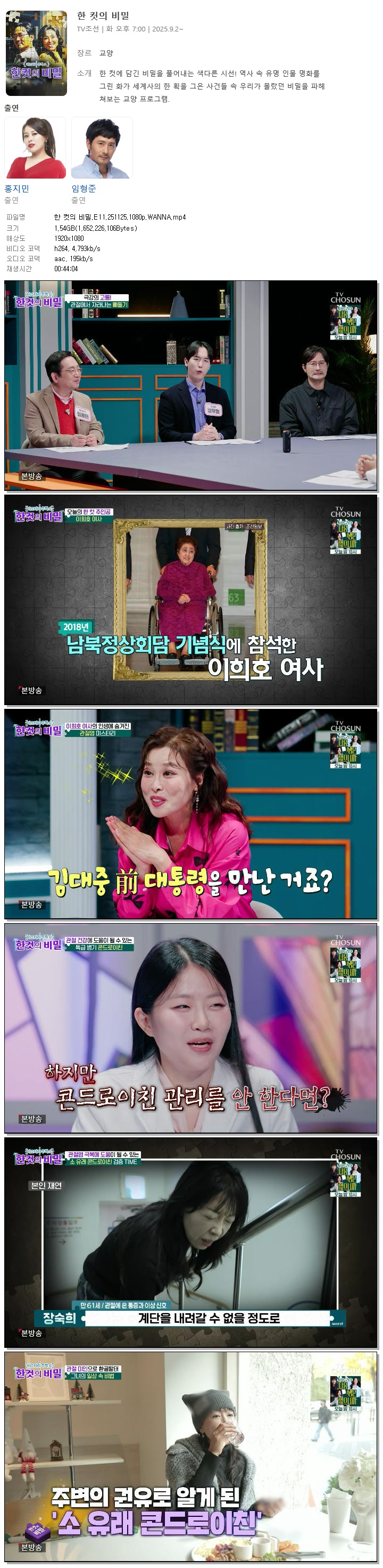| [TV조선] 한 컷의 비밀.E11.251125.1080p.WANNA[홍지민, 임형준].mp4 | 1.5 G | 00:44:04 | 1920x1080 |