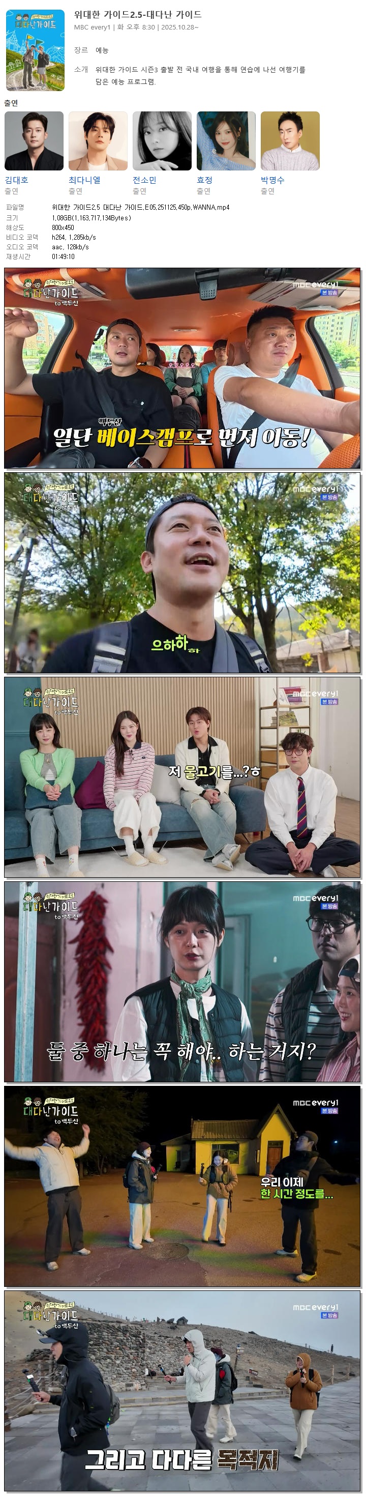 | [MBC Every1] 위대한 가이드2.5 대다난 가이드.E05.251125.450p.WANNA[김대호, 최다니엘].mp4 | 1.1 G | 01:49:10 | 800x450 |