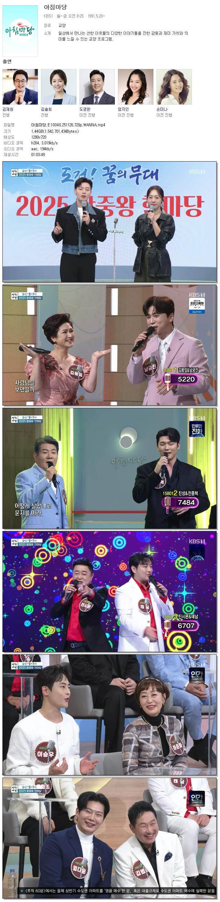 [KBS1] 아침마당.E10040.251126.720p.WANNA[김재원, 엄지인].mp4 1.4 G 01:03:49 1280x720