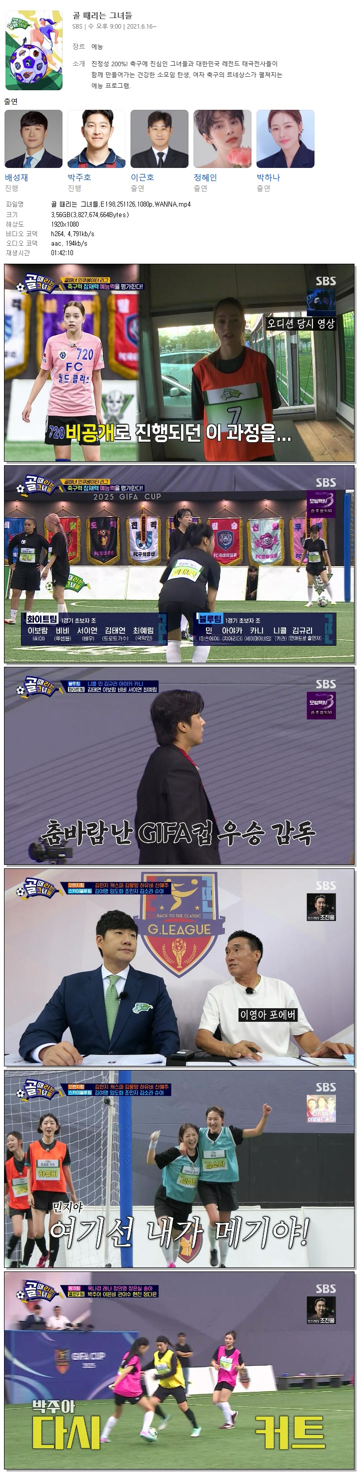 | [SBS] 골 때리는 그녀들.E198.251126.1080p.WANNA[강보람, 이승연].mp4 | 3.6 G | 01:42:10 | 1920x1080 |