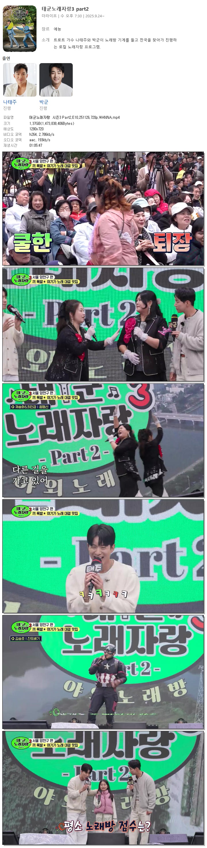 | [더라이프] 태군노래자랑 시즌3 Part2.E10.251126.720p.WANNA[나태주, 박군].mp4 | 1.4 G | 01:05:47 | 1280x720 |