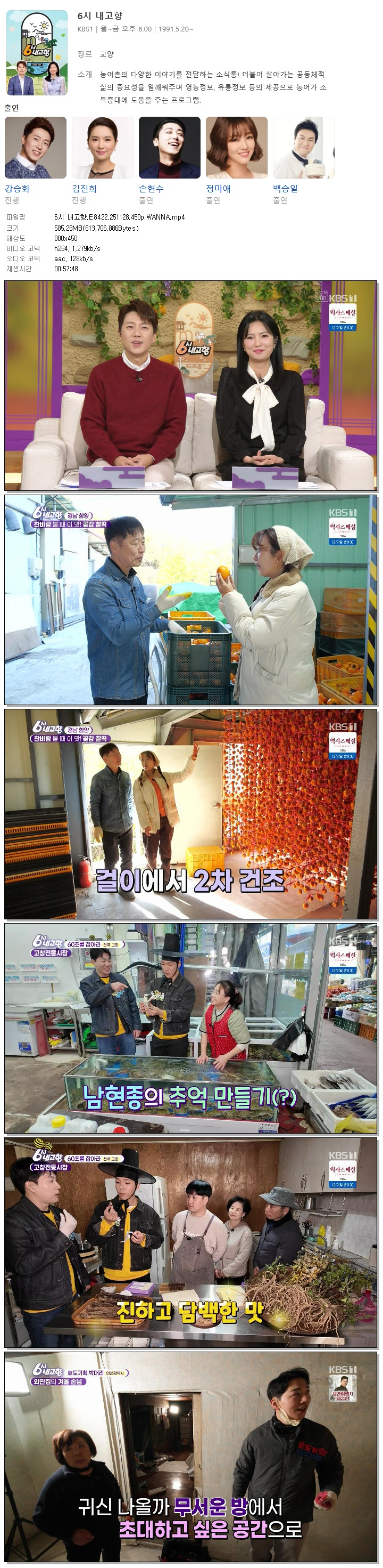 | [KBS1] 6시 내고향.E8422.251128.450p.WANNA[강승화, 김진희].mp4 | 585.3 M | 00:57:48 | 800x450 |