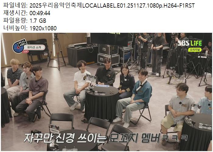 | 2025우리음악인축제LOCALLABEL.E01.251127.1080p.H264-F1RST.mp4 | 1.7 G | 00:49:44 | 1920x1080 |