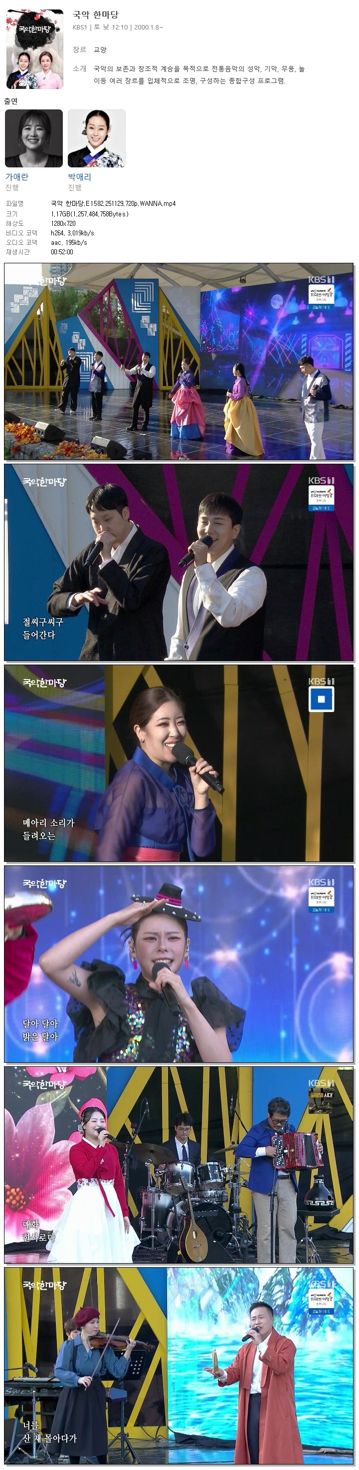 | [KBS1] 국악 한마당.E1582.251129.720p.WANNA[박애리].mp4 | 1.2 G | 00:52:00 | 1280x720 |