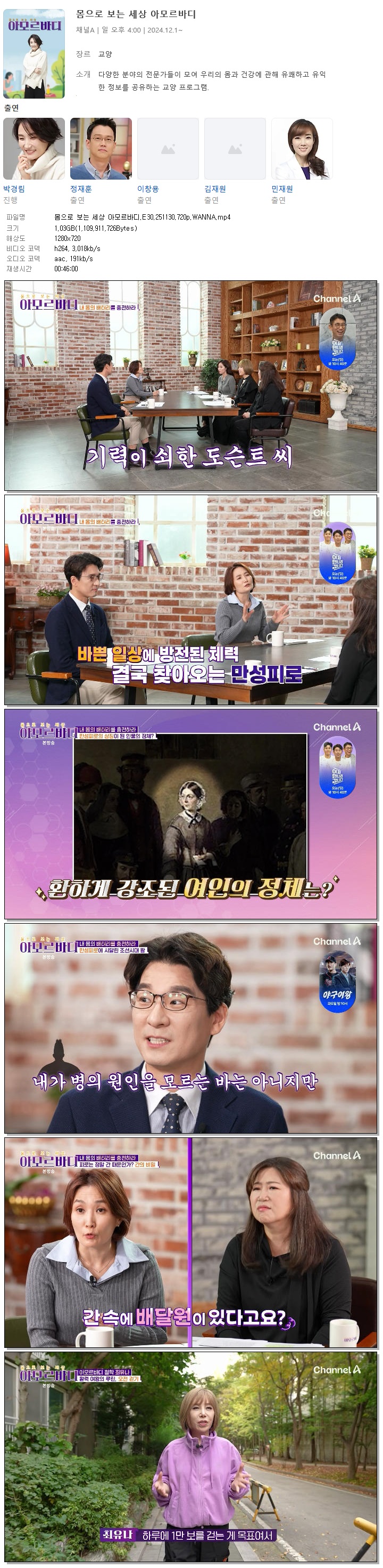 | [채널A] 몸으로 보는 세상 아모르바디.E30.251130.720p.WANNA[박경림].mp4 | 1 G | 00:46:00 | 1280x720 |