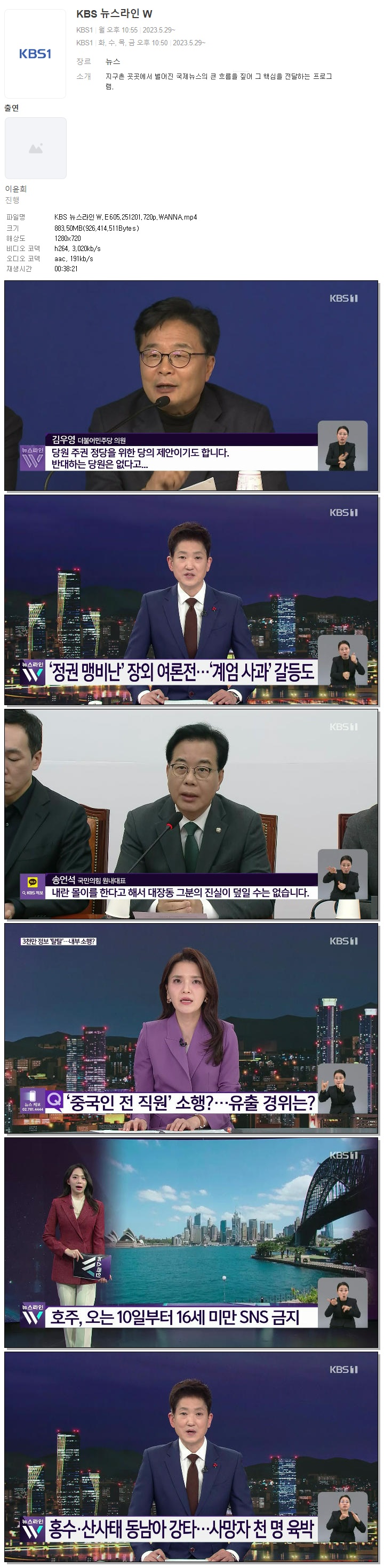 | [KBS1] KBS 뉴스라인W.E605.251201.720p.WANNA.mp4 | 883.5 M | 00:38:21 | 1280x720 |