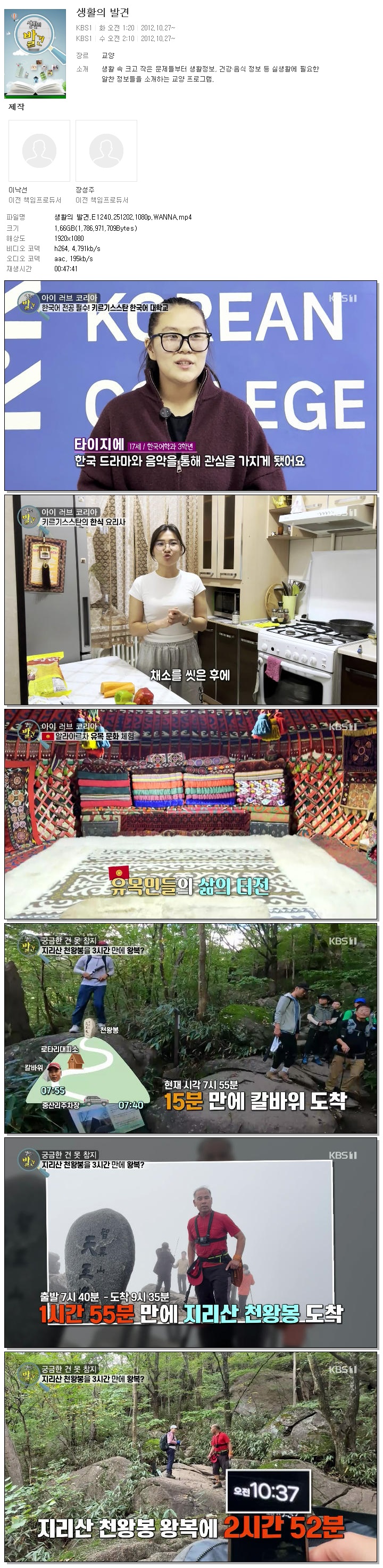 | [KBS1] 생활의 발견.E1240.251202.1080p.WANNA.mp4 | 1.7 G | 00:47:41 | 1920x1080 |