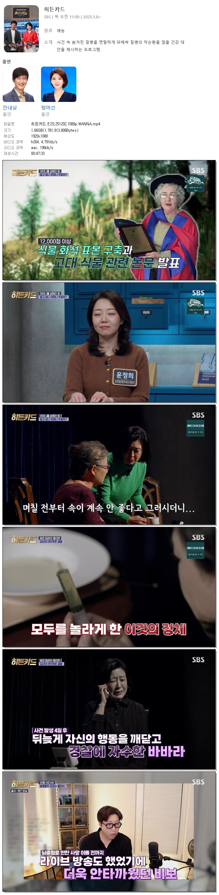 | [SBS] 히든카드.E20.251202.1080p.WANNA[안내상, 정미선].mp4 | 1.7 G | 00:47:33 | 1920x1080 |