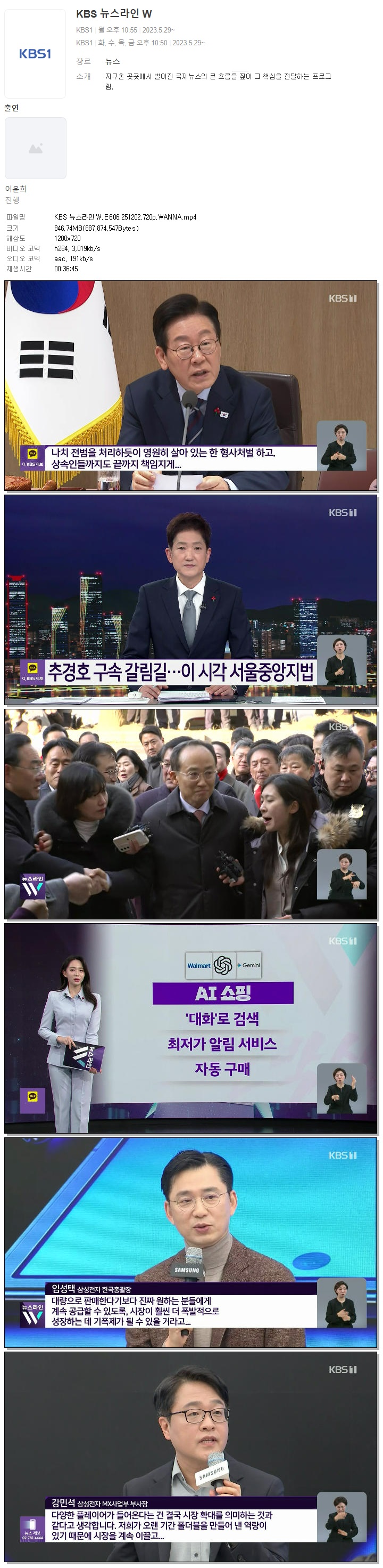 | [KBS1] KBS 뉴스라인W.E606.251202.720p.WANNA.mp4 | 846.7 M | 00:36:45 | 1280x720 |