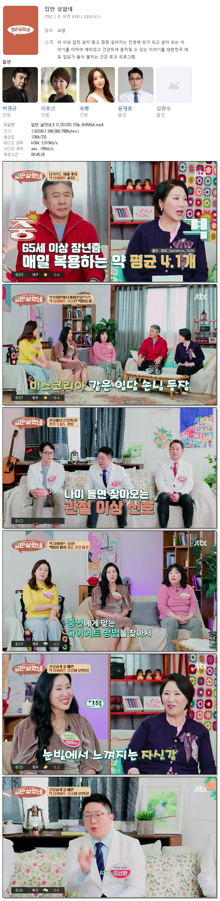 | [JTBC] 입만 살았네.E12.251203.720p.WANNA[박영규, 이호선].mp4 | 1 G | 00:45:26 | 1280x720 |