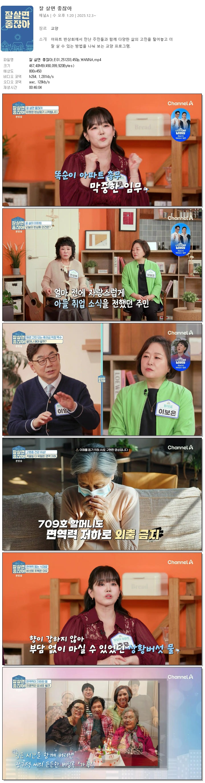 [채널A] 잘 살면 좋잖아.E01.251203.450p.WANNA[선우재덕, 정미애].mp4 467.4 M 00:46:04 800x450