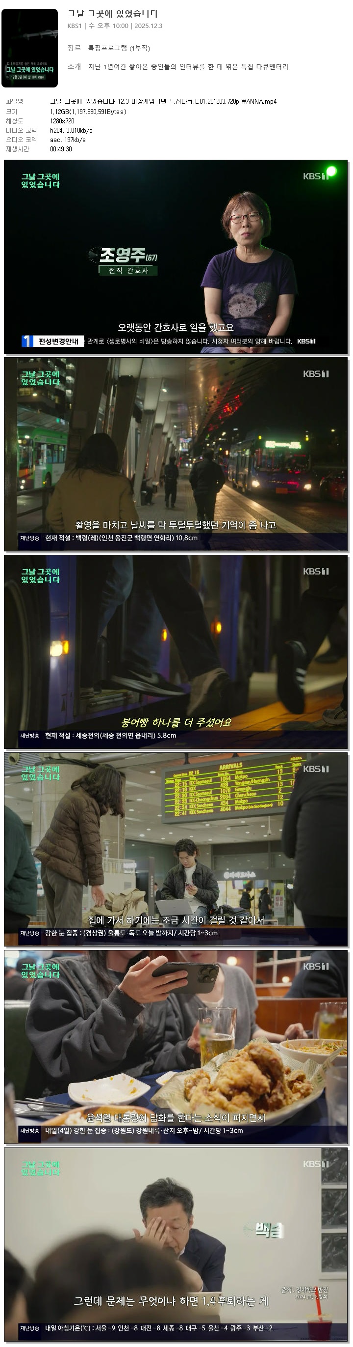 | [KBS1] 그날 그곳에 있었습니다 12.3 비상계엄 1년 특집다큐.E01.251203.720p.WANNA.mp4 | 1.1 G | 00:49:30 | 1280x720 |